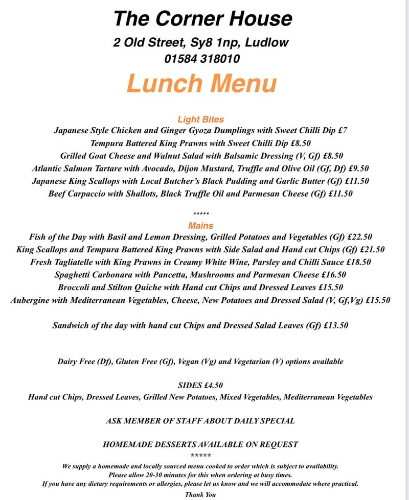 At The Corner House Ludlow, we take pride in offering a diverse menu that caters to all dietary preferences. Our dishes are home made and we are using fresh, locally sourced ingredients to ensure the highest quality and taste. Full menu can be sent out on request as it is changing regularly.